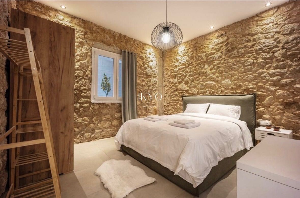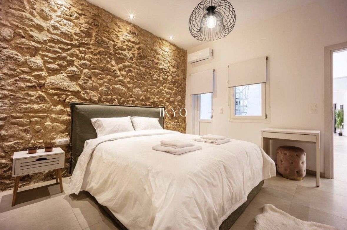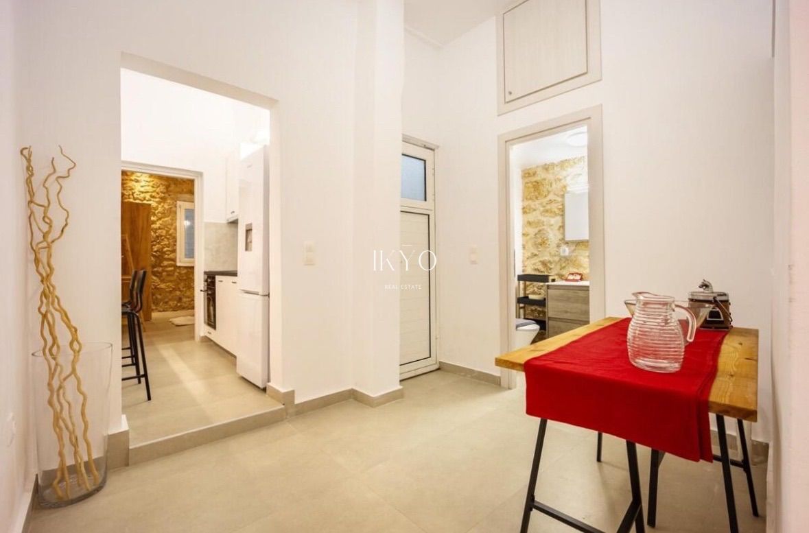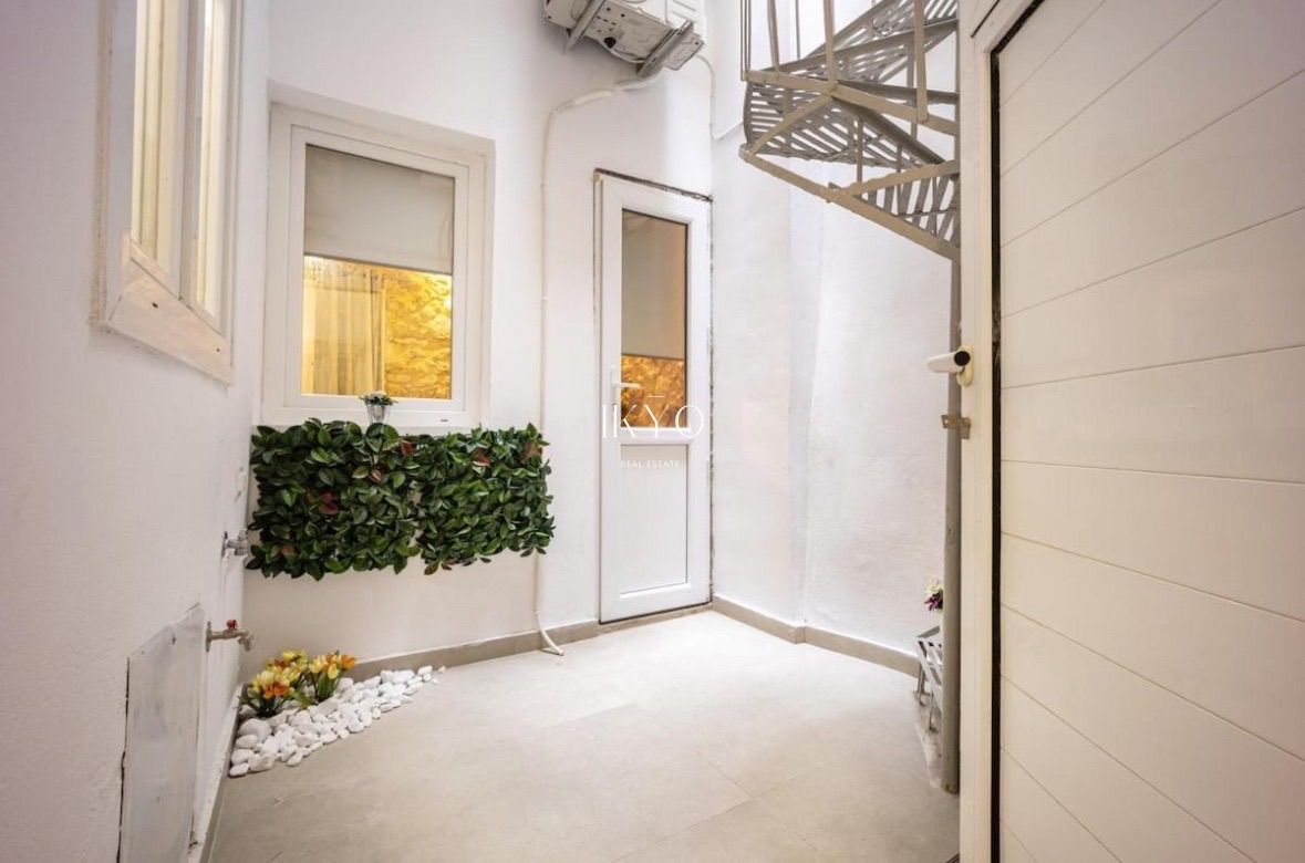 It features an independent entrance and full autonomy. The layout includes a bright living area, two bedrooms, a separate kitchen, a dining area, and a modern bathroom. The internal courtyard offers privacy and a sense of calm, while access to the shared rooftop on the second floor provides open views of the sea, Piraeus, and Athens—an element that significantly enhances the property’s value.