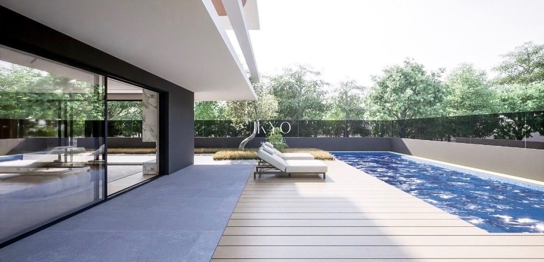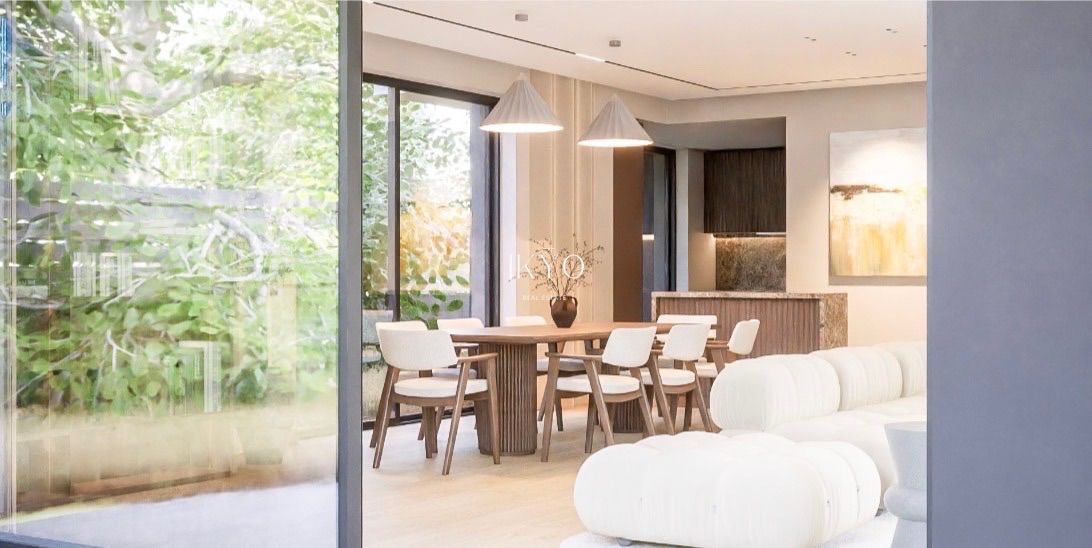 The ground floor features a bright open-plan layout where the living and dining areas connect seamlessly with the kitchen, creating a functional space suited for both everyday living and entertaining. Large openings enhance natural light and provide direct access to the private garden and pool, strengthening the indoor–outdoor lifestyle. A guest WC completes this level.