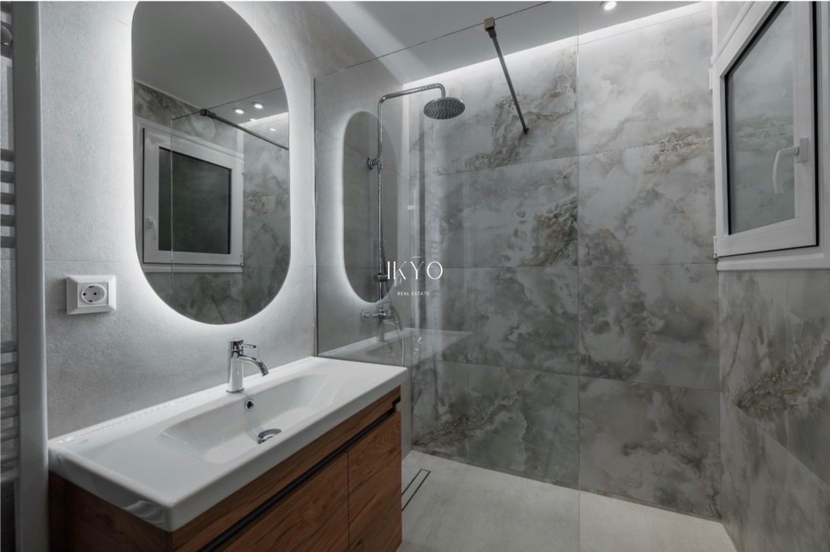 The renovation includes completely new electrical and plumbing installations, high-quality Exalco aluminum window frames with shutters, a security entrance door, new interior doors and brand-new bedroom wardrobes. The flooring consists of Italian tiles and high-durability German vinyl, while the kitchen is built with quality Egger materials and is equipped with built-in appliances including an oven, cooktop, extractor hood, dishwasher and refrigerator.