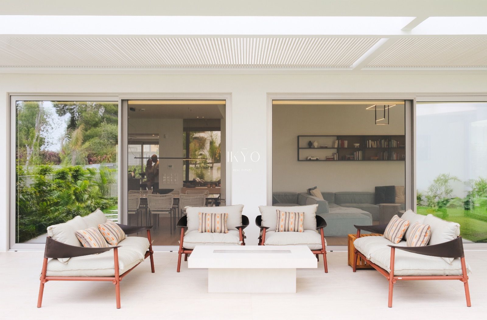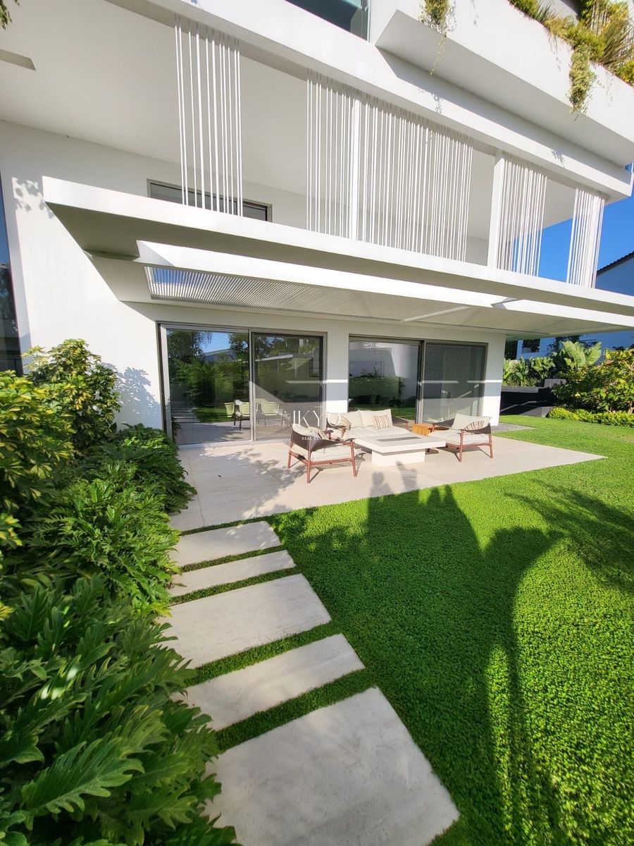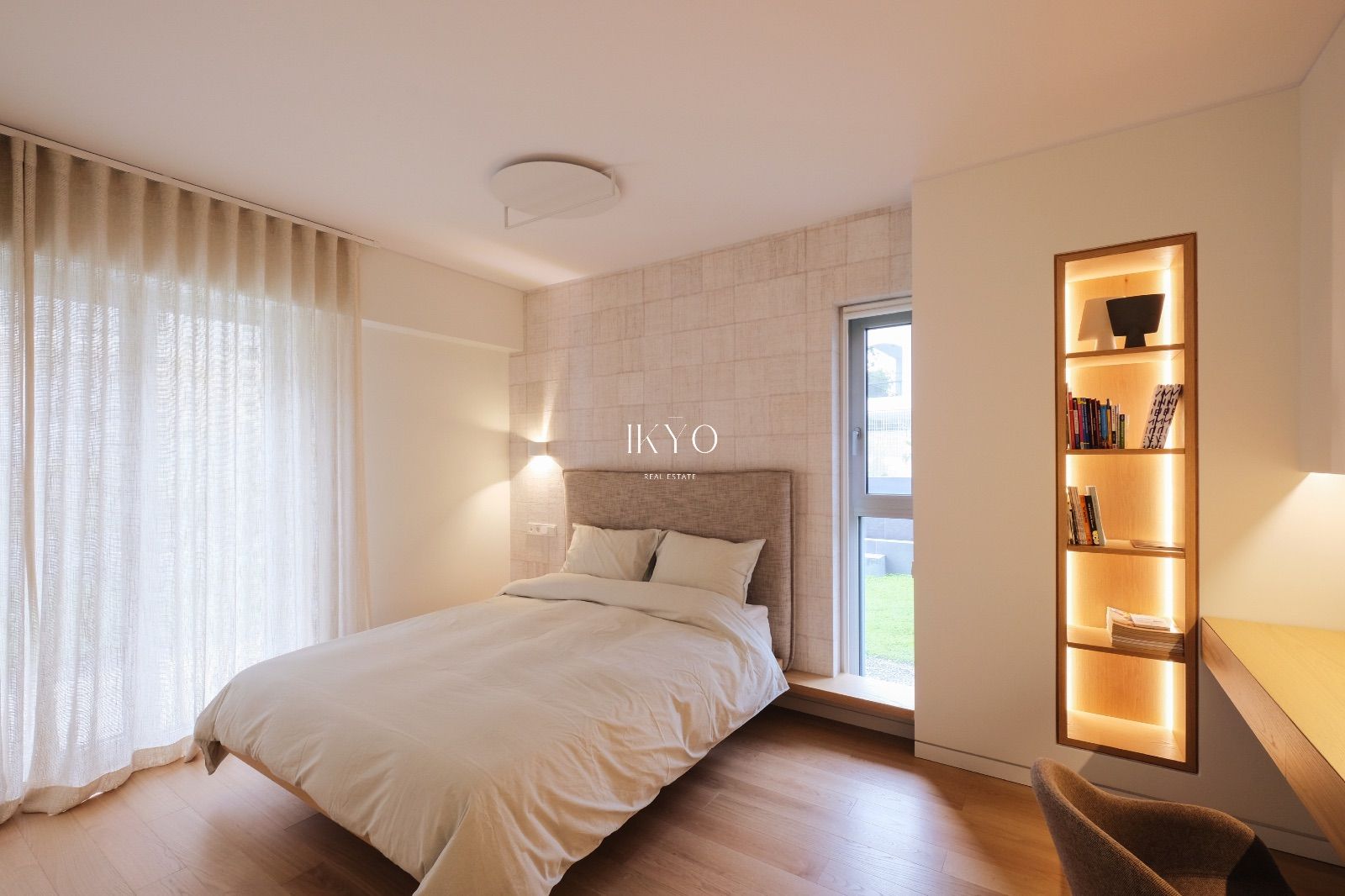 The ground floor (123 sq.m.) consists of a spacious open-plan living and dining area with large openings that lead directly to the private garden, a fully equipped kitchen with built-in Miele appliances, a guest WC, and a generous master bedroom with its own bathroom and walk-in wardrobe. The outdoor area surrounds the residence and includes the 19 sq.m. heated swimming pool, equipped with an oxygen-based cleaning system and an integrated counter-current swimming system.