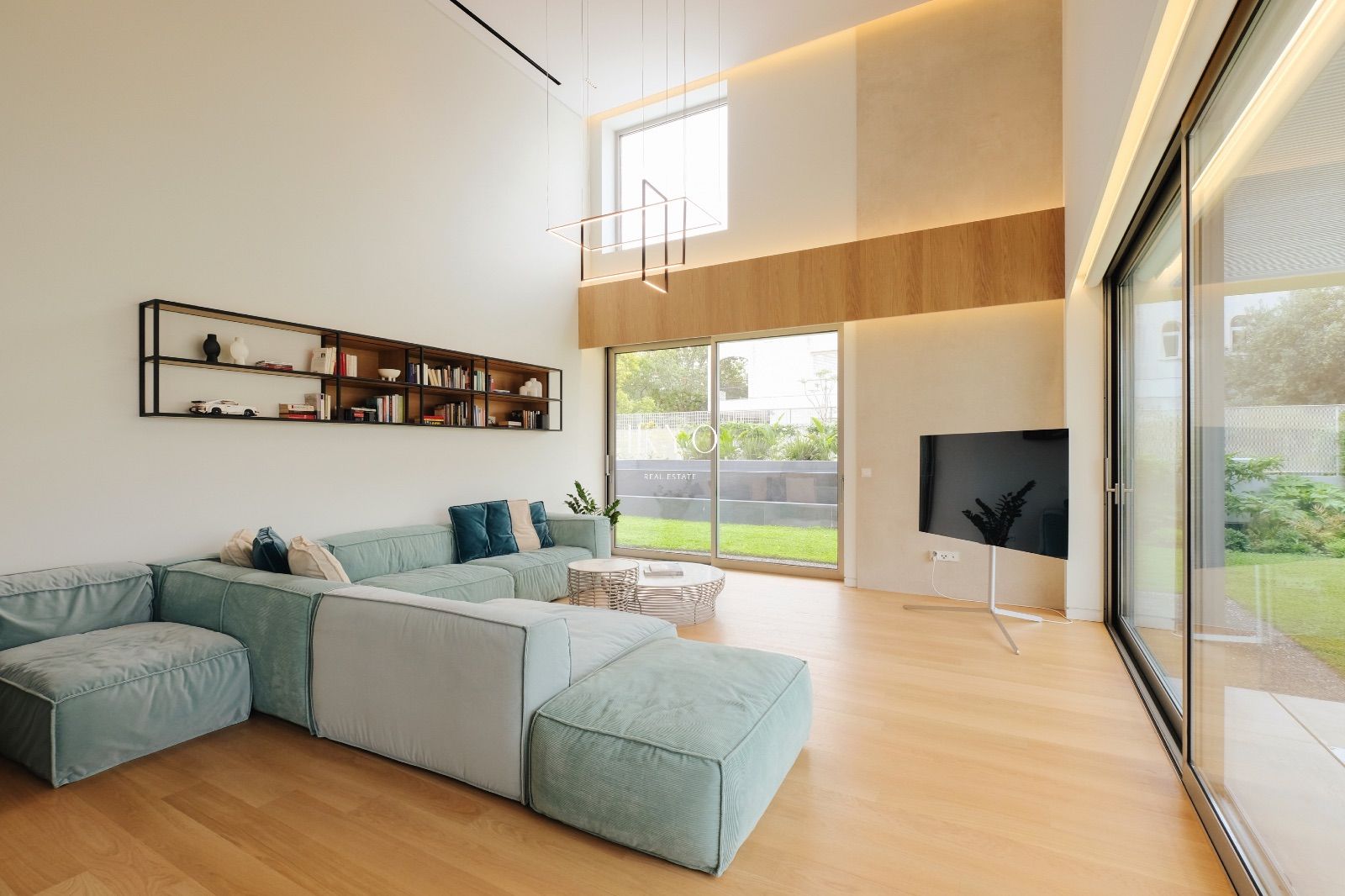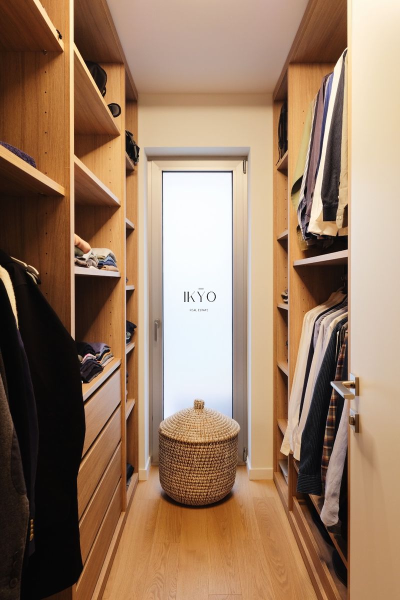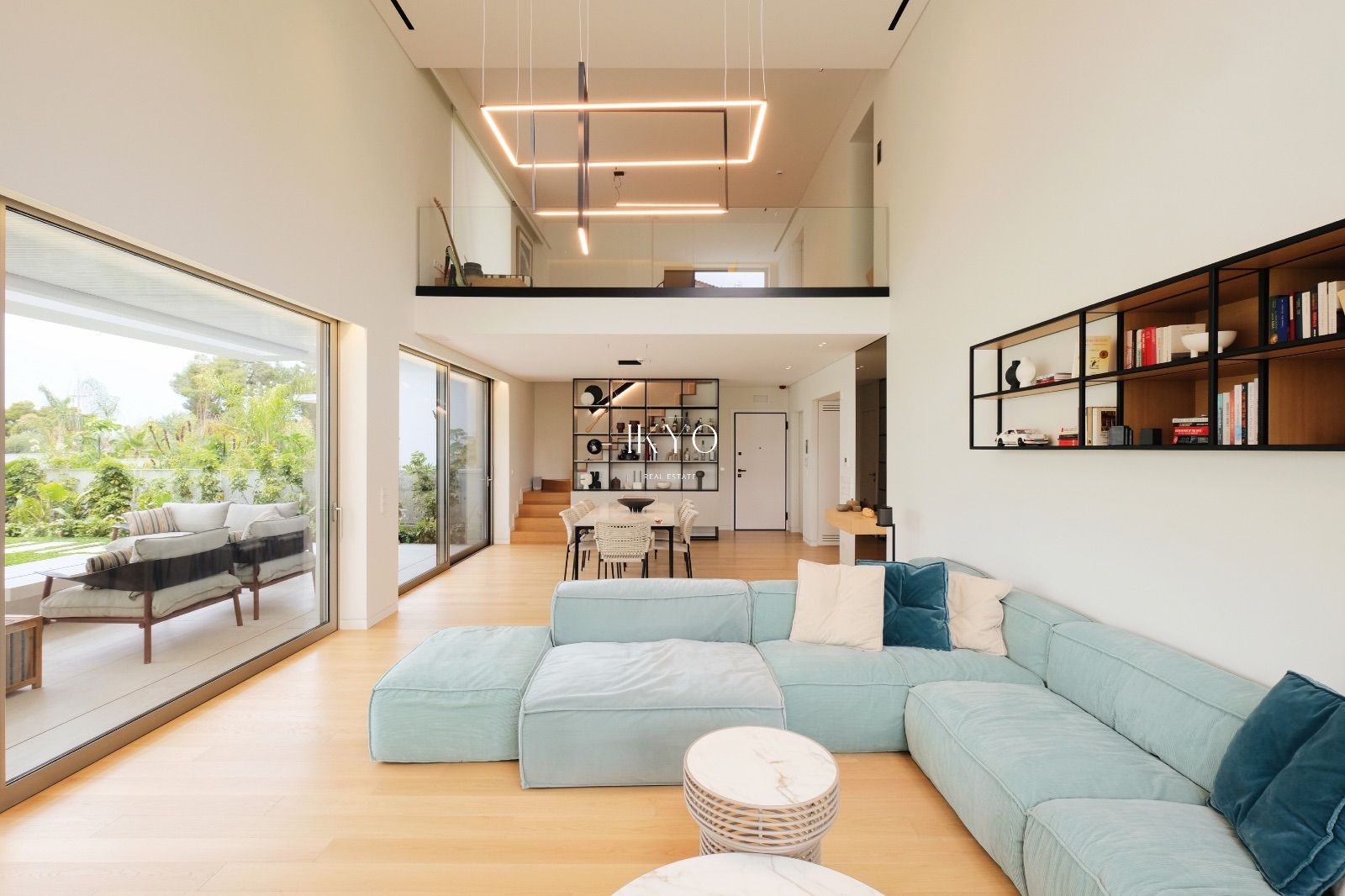 The ground floor (123 sq.m.) consists of a spacious open-plan living and dining area with large openings that lead directly to the private garden, a fully equipped kitchen with built-in Miele appliances, a guest WC, and a generous master bedroom with its own bathroom and walk-in wardrobe. The outdoor area surrounds the residence and includes the 19 sq.m. heated swimming pool, equipped with an oxygen-based cleaning system and an integrated counter-current swimming system.