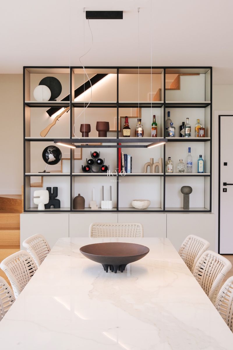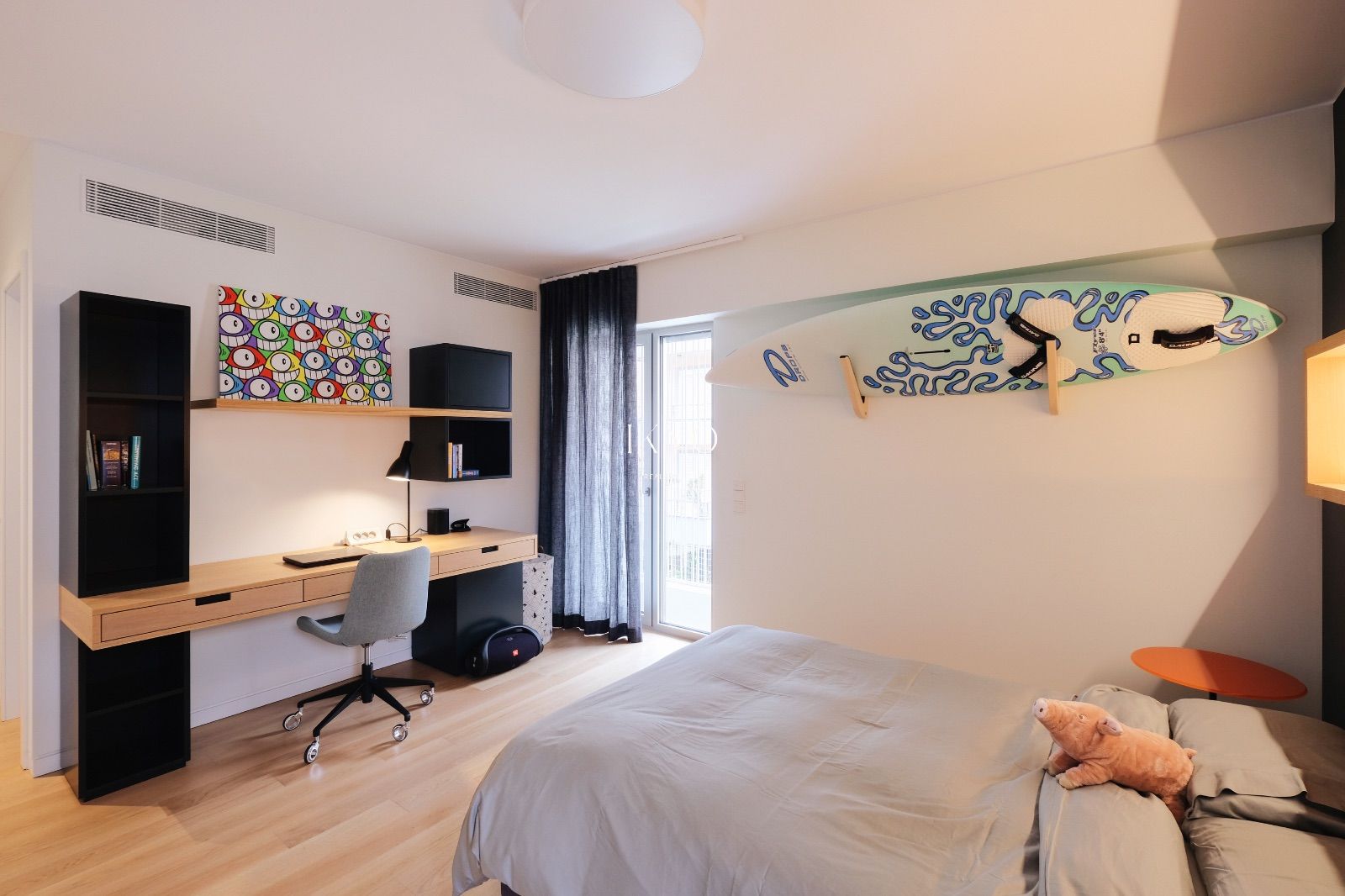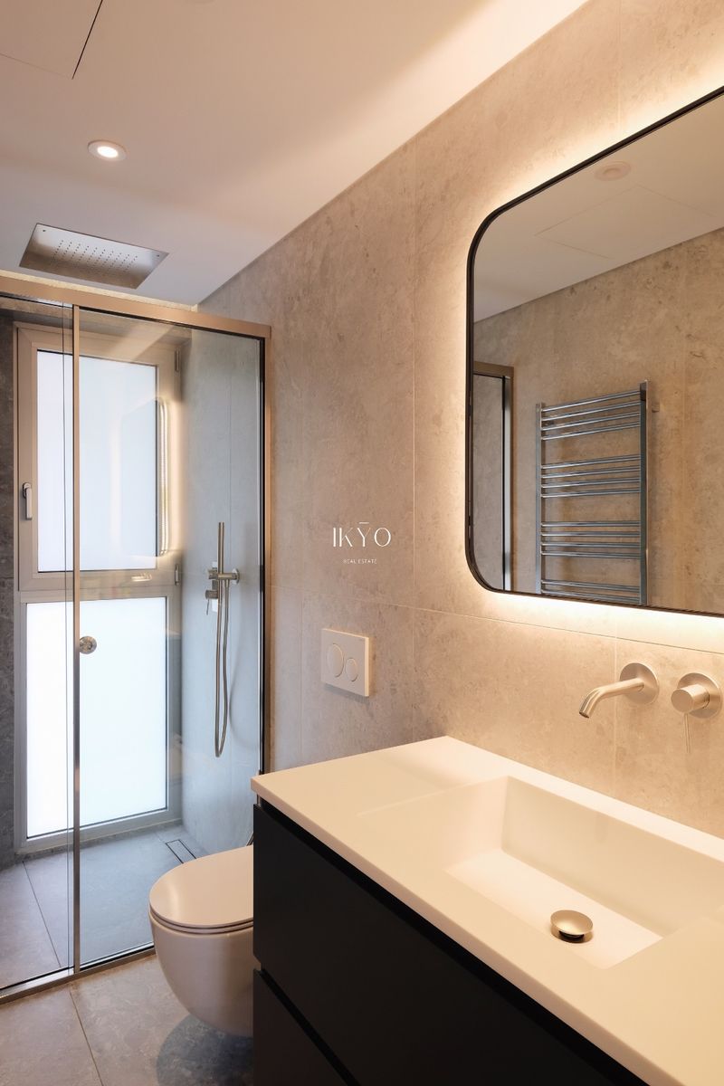 All three levels are connected via an internal oak staircase and a private KONE elevator. The residence features ducted air conditioning, a Mitsubishi heat pump connected to a boiler and underfloor heating, while electricity consumption is offset through a photovoltaic system. The property is offered fully furnished and equipped.